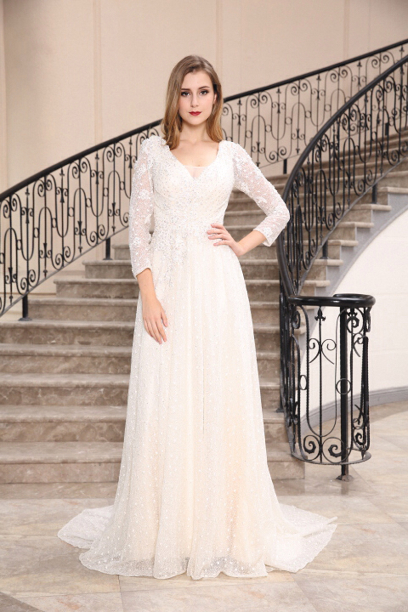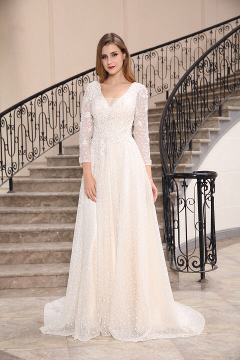 2017新款深V七分袖新娘结婚婚纱显瘦结婚宴会